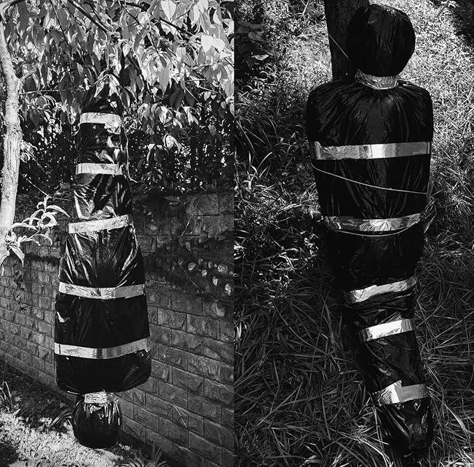Haz que todos se detengan a mirar (¡y a gritar!) con este cadáver falso colgante, envuelto en una bolsa de plástico negra realista. Perfecto para decorar puertas, patios, jardines o pasillos. Este set DIY incluye todo lo necesario para simular un cuerpo humano realista, colgado y envuelto con detalles que harán pensar a más de uno que es de verdad.