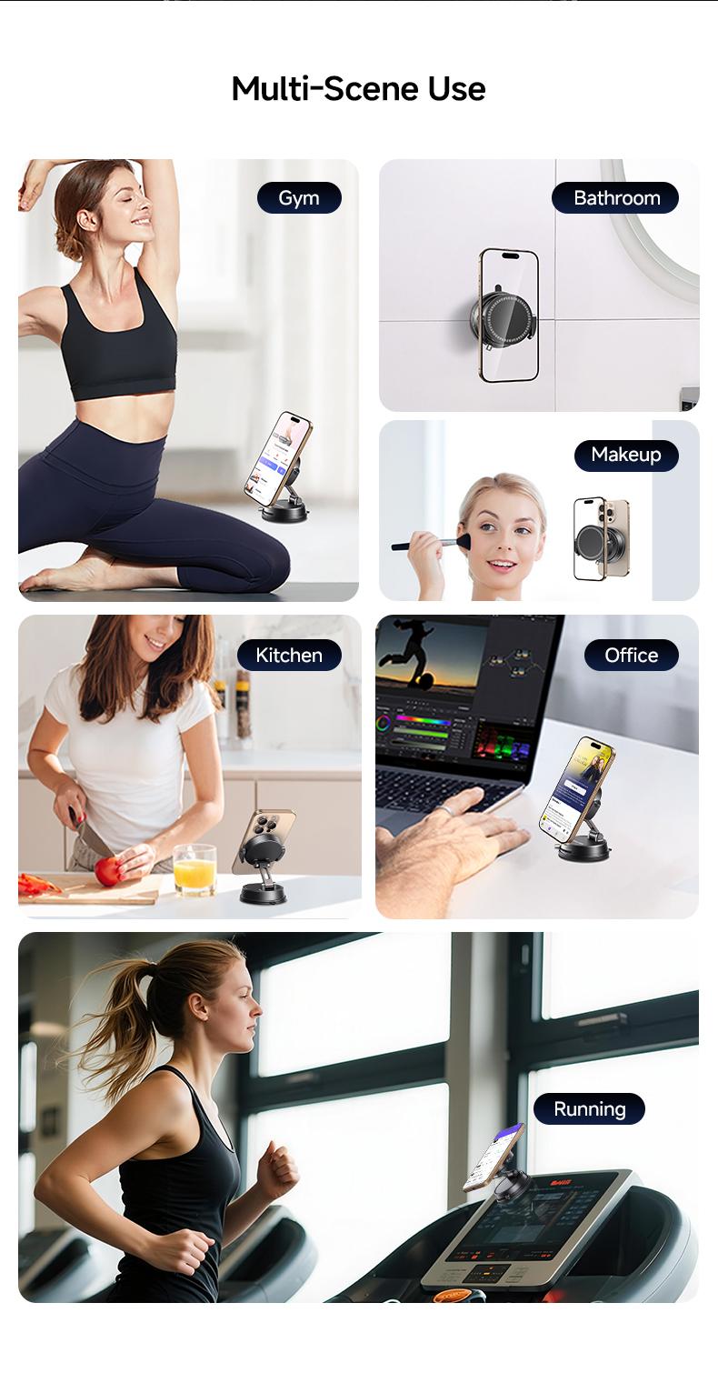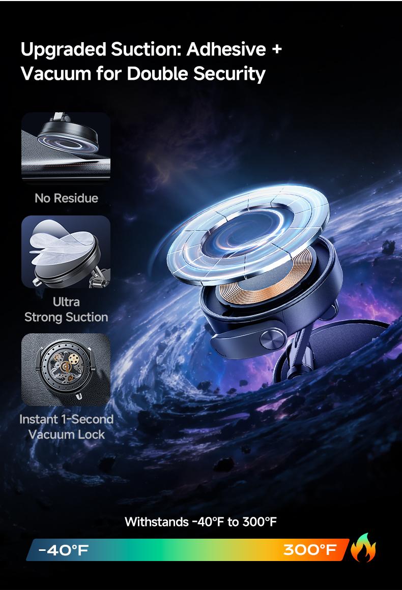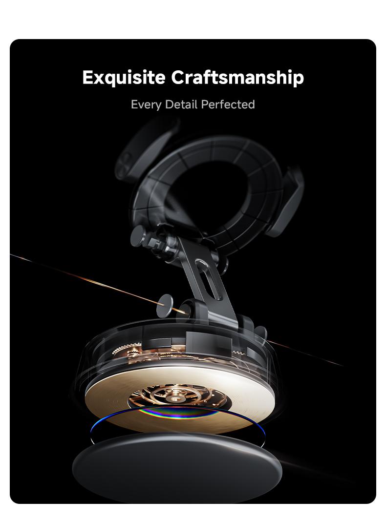La base de succión al vacío y su adhesivo industrial garantizan una estabilidad inigualable sobre cualquier superficie. Ideal para el parabrisas, tablero o incluso el escritorio.